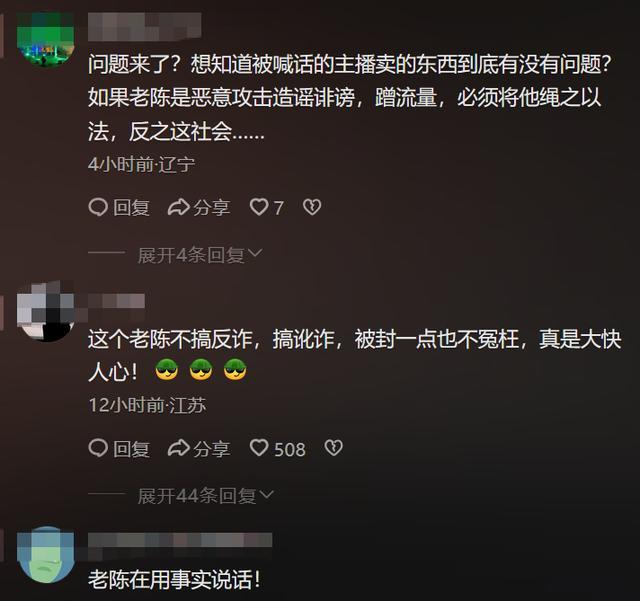 一方认为老陈说的话不可信,所谓的打假,又不是乱打、瞎打,在没有证据的情况下乱扣帽子,这不是助力网暴呢吗?早就该被治理了,把网络搞得乌烟瘴气的。不光是反诈老陈,还有一些蹭流量毫无底线的账号,抖音也该整治整治。
