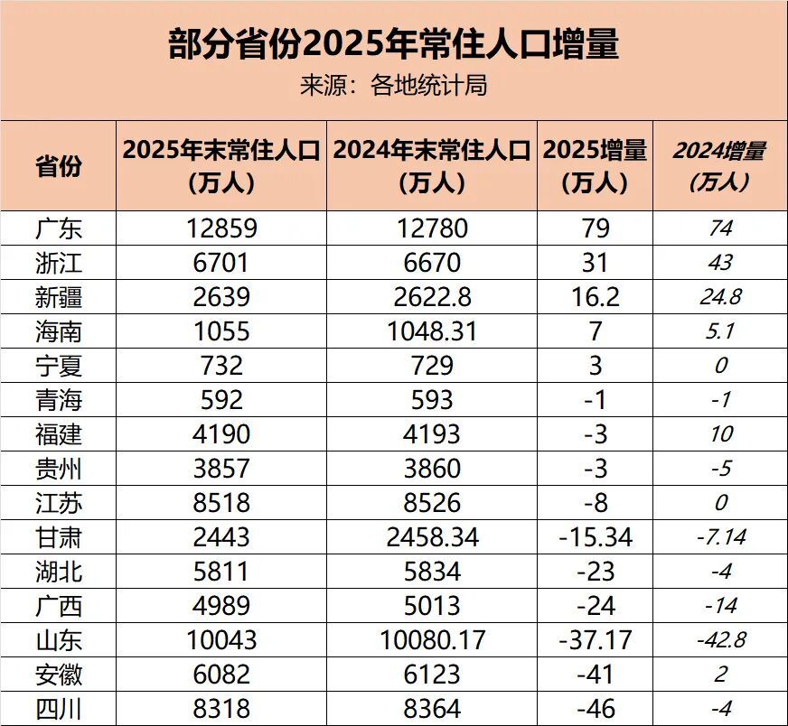 2025年,人口增长最显著的还是广东,净增79万人,也是该省近五年增长最多的一年。