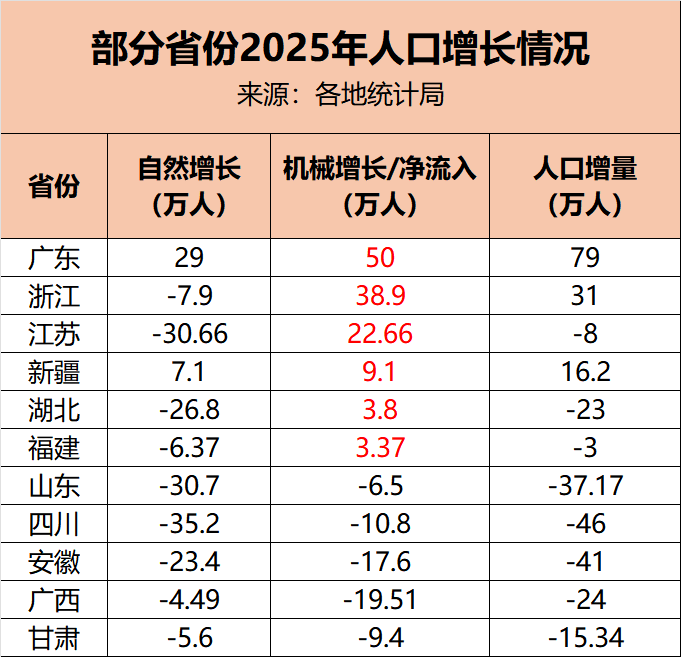 下面是部分省份2025年人口的机械增长情况: