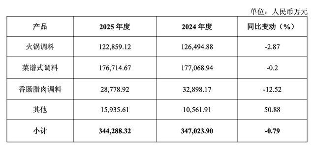 除香肠腊肉调料外,公司另外两大核心品类均未能实现增长,进一步放大业绩压力。其中,火锅调料营收12.29亿元,同比下降2.87%,作为占比超 35%的第一大品类,其增长乏力直接影响整体营收稳定性;菜谱式调料营收17.67亿元,同比微降0.20%,虽降幅较小,但作为营收规模最大的品类(占比超 51%),未能贡献正向增长成为业绩拖累因素之一。
