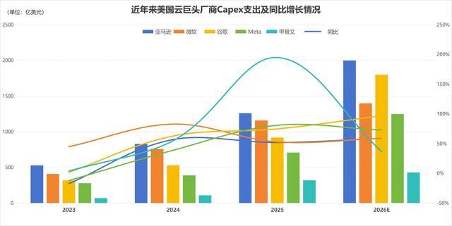 2025年,以微软、谷歌、亚马逊、Meta等大型云厂商为代表的科技巨头,已经以超4000亿美元的大规模资本开支(Capex)极大拉动了算力硬件产业链需求,到了2026年,相关资本开支还会继续增长到6500亿美元的惊人水平。受此影响,产业链需求继续高增。